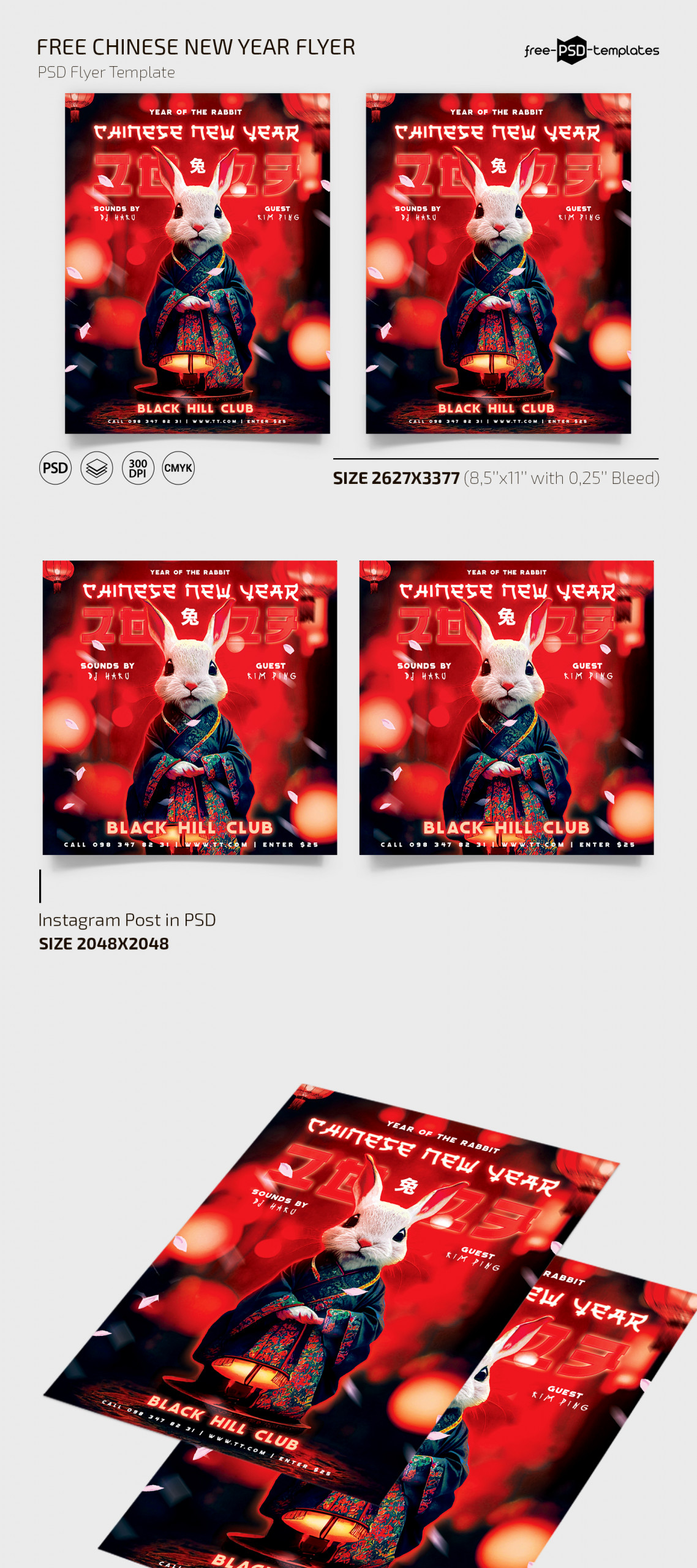 Have no doubts as you download our Free Chinese New Year Flyer Template and Instagram Post in PSD. This one-of-a-kind product will help you succeed at promoting a big, themed event. The news about your fantastic night will spread quickly with both a flyer sample and a matching Instagram post template. We guarantee that an image of a toy rabbit in traditional clothing will draw the attention of your future guests. In addition to the New Year’s symbol, an intense red background and stylish fonts make this product look even more atmospheric.