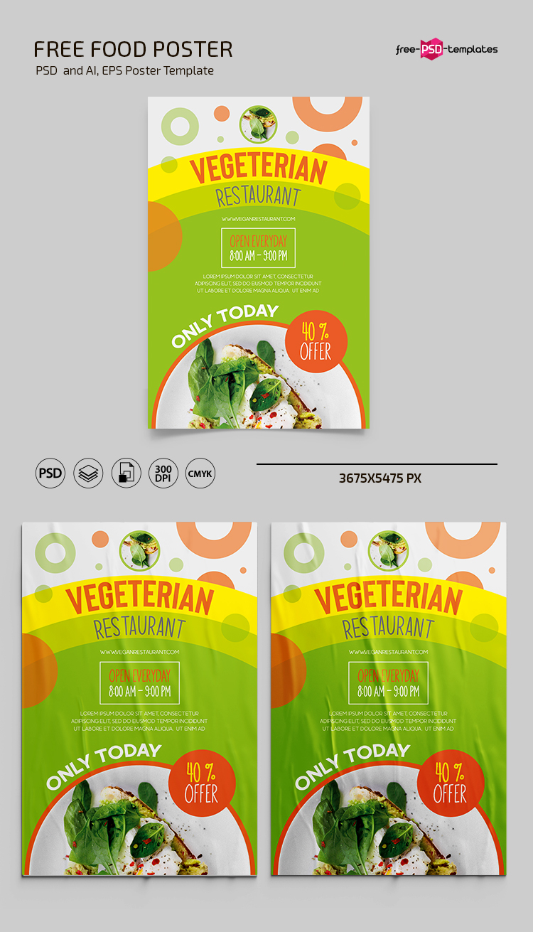 Everyone in the city should know about the delicious food offered in your place. To make your services and products famous, we offer you to use this magnificent food poster template. It is free and beautiful! The design of the layout contains a crazy number of different colours which look awesome together. In the sample, you see a special offer for vegetarians. Nevertheless, you can use the template for promoting any other type of food, too. Replace the main photo, change the colours, move the elements – be your own designer!